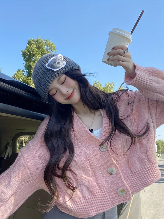 Women's Casual V-Neck Cropped Sweater - High Elasticity Long Sleeve Open Front Button Detail, Loose Fit Solid Color Spring/Fall Layering Essential, Cute Sweaters, Comfortable Knitwear, Durable Knitwear