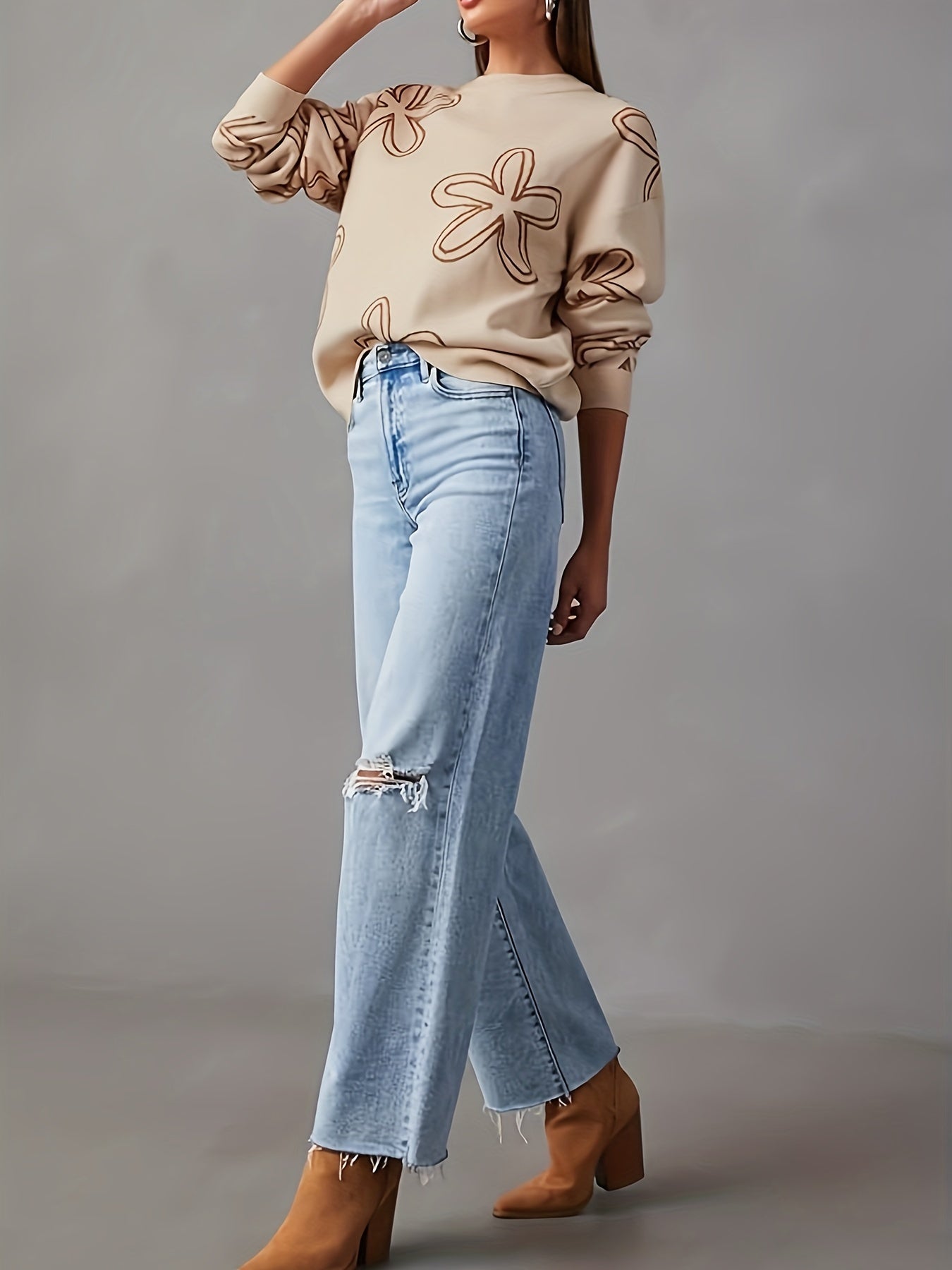Long Sleeve Floral Print Cable Knit Casual Crewneck Sweaters For Women Pullover Sweater Tops