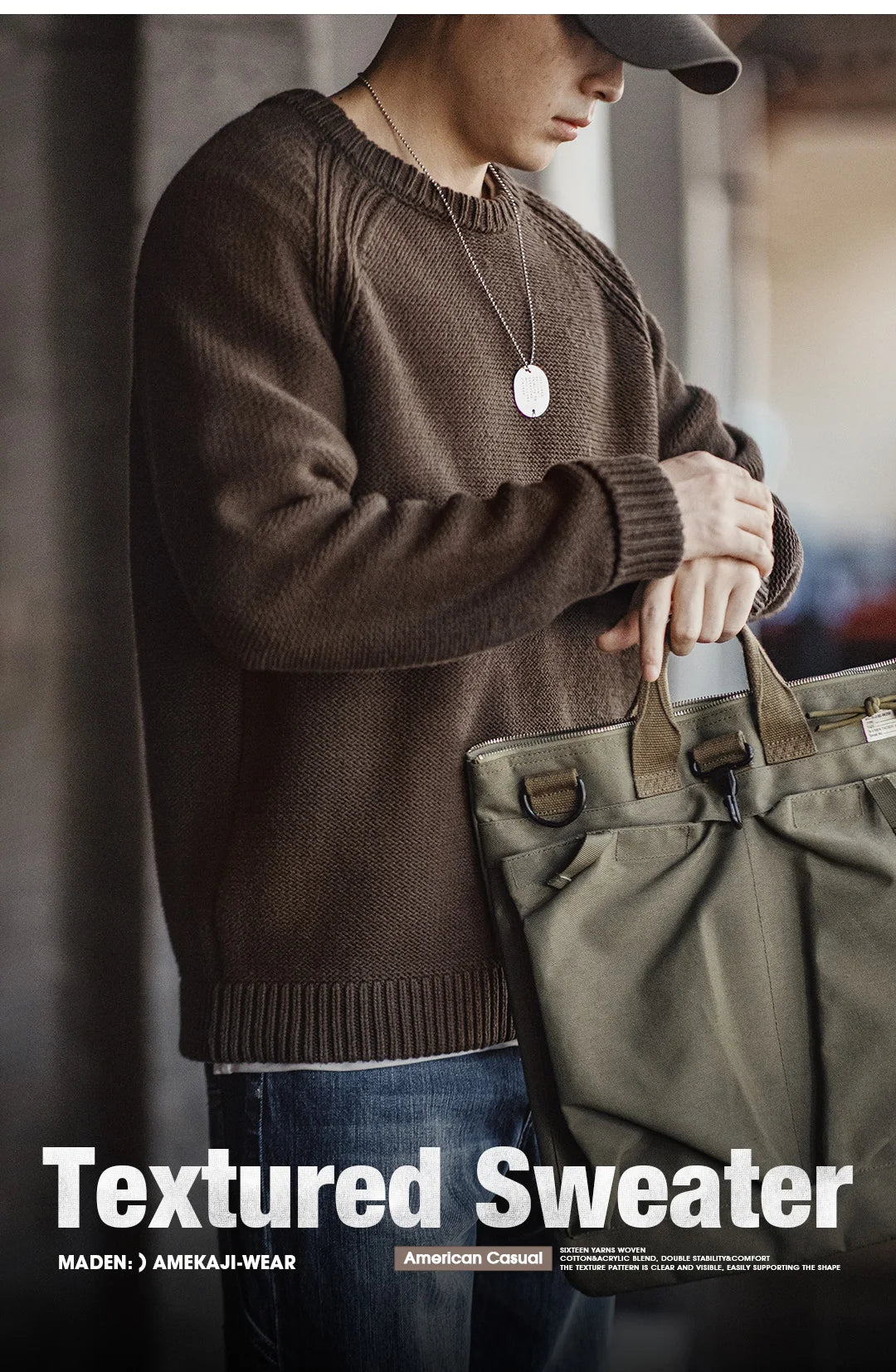 Maden New Vintage Heavyweight Knitted Crew-neck Sweater Brown Warm Pullover Men's Versatile Top for Autumn and Winter Knitwear